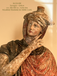 * TANAGRA : statuette de terre cuite peinte représentant souvent des femmes dans les gestes du quotidien. La cité de Tanagra ayant donné son nom à ces objets décoratifs pouvant servir également de jouets, était un lieu de production renommé. Celle-ci date d’environ 330-300 avant notre ère.